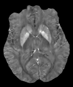 Image QSM obtenue sur le cerveau à ultra-haut champ sur laquelle des structures profondes de la substance grise peuvent être visualisées avec des détails très fins et leur contenu en fer suivi dans le temps.